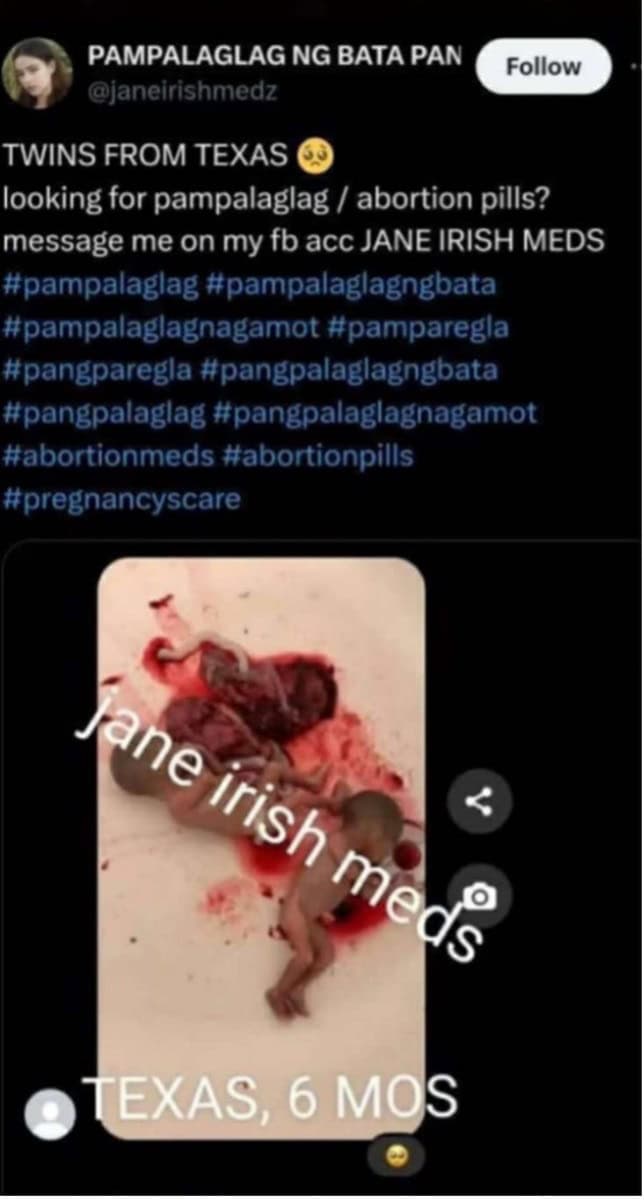 Αυτές οι φωτογραφίες των μωρών αποστέλλονται από τις γυναίκες που πήραν τα χάπια προς τους πωλητές, ως απόδειξη ότι το προϊόν τους λειτουργεί. Οι πωλητές, με την σειρά τους, χρησιμοποιούν αυτές τις φωτογραφίες των θυμάτων της έκτρωσης για να διαφημίσουν τα προϊόντα τους σε άλλους πιθανούς αγοραστές. Το μήνυμα είναι απλό: «Ιδού η επιβεβαίωση ότι αφού πάρετε αυτά τα χάπια, το μωρό σας θα πεθάνει. Ίσως όχι αμέσως, αλλά λίγο μετά την γέννηση».